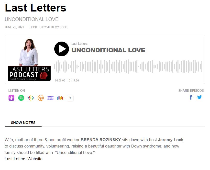 I’m excited to announce that my sister Brenda was featured on the June 22, 2021 episode of this great podcast. The title is “Unconditional Love.“